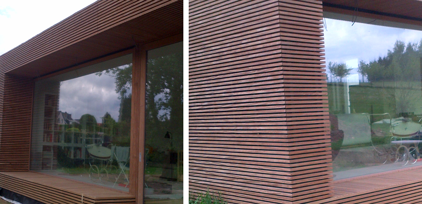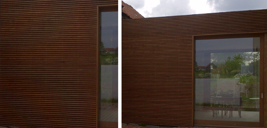 De afwerking kan ook gebeuren met houten latwerk in horizontale of verticale uitvoering met gesloten beplanking of open lamellen structuur. Voor deze houten gevelbekleding zijn verschillende profileringen mogelijk, aslook verscheidene houtsoorten zoals padoek, afrormosia, lariks, ceder, eik en thermowood of ipé, ook volledig afeglakt composiet houten sidings van werzalit behoort tot de mogelijkheden.